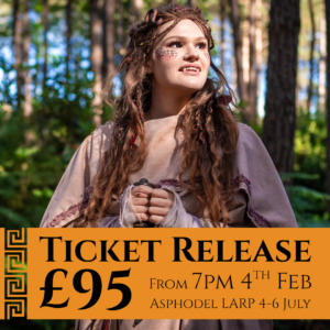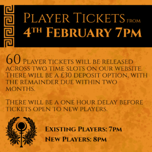 Sleeping: IC and OC camping areas available for players and crew. Limited bunks in shared rooms available to apply for on accessibility grounds only; please email in after booking your ticket. If this is a requirement to attend (you cannot camp or stay off-site) we will give full refunds if the bunks are over-subscribed.