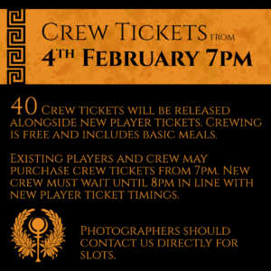 If you are interested in crewing an event in a more specifical way than playing NPC roles, please contact the team! We are constantly looking for more crew to help bring the game to life, and aim to write special roles for every member of crew who books in advance, as well as casual ambient roles to have breaks and socialise with players.
